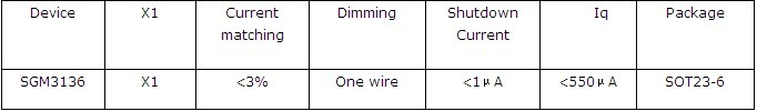 SGM3136作為圣邦微電子新近推出的低壓差模式白光LED燈驅(qū)動,相對市場上現(xiàn)有同類產(chǎn)品在性能上做了充分的改善,壓差降低到20mA電流條件下約為35mV(TYP),可以完美支持3顆LED在較低的電池電壓下(<3.5V)穩(wěn)定工作,工作電壓為2.5~5.0V, 通道間電流匹配度誤差小于3%,可以實(shí)現(xiàn)模組均勻亮度背光。支持單線脈沖調(diào)光,可以實(shí)現(xiàn)16級調(diào)光,關(guān)斷模式下,靜態(tài)電流小于5μA,可以充分滿足各種便攜產(chǎn)品的應(yīng)用。