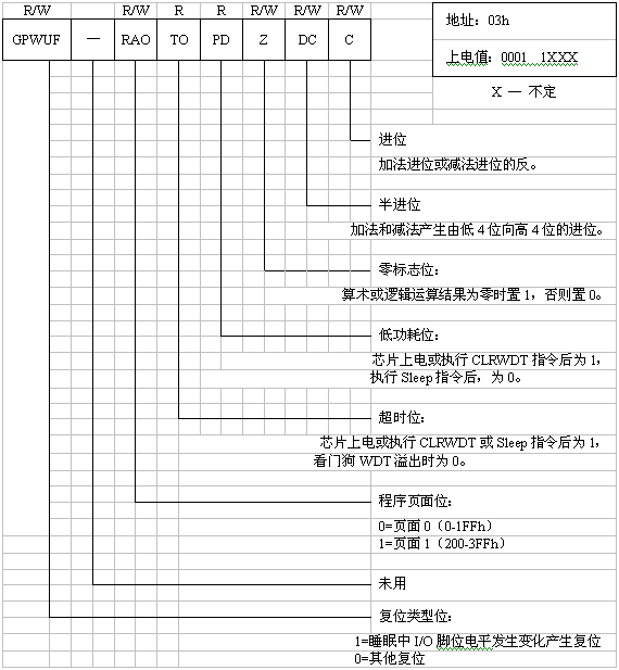 STATUS寄存器包含了ALU的算術狀態(tài)、芯片復位狀態(tài)、程序頁面位等信息。STATUS 可以被讀/寫,但是其中的復位狀態(tài)位TO、PD不能由軟件設置,它們的狀態(tài)如何決定§1.12.7 會有詳細描述。