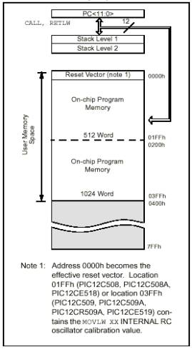 PIC12C5XX程序計數器PC最多可尋址1K(1024)程序區(qū):